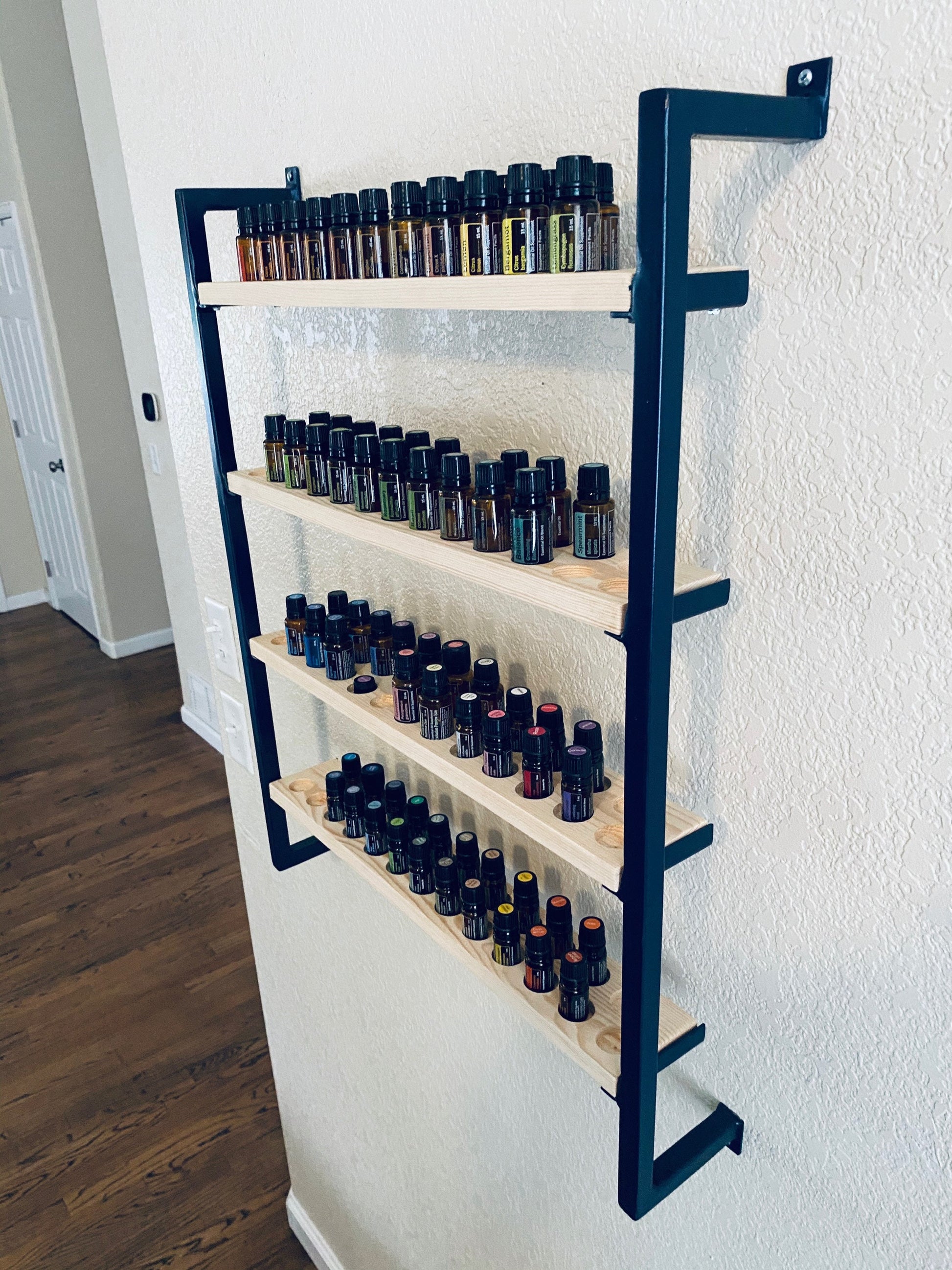 Have a great metal and wood essential oil shelf. Can make you any size you would like the one in the picture is 4 shelves. 25 oils a shelf totaling 100 oils can make taller, wider or smaller. Where ever it will fit great in your home. Some Assembly required